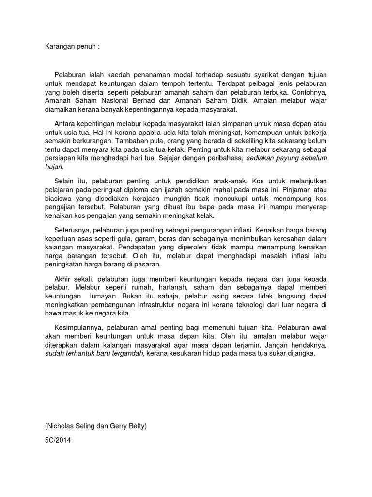 Sebagai makluman kepada pelajar, penulisan karangan khususnya bagi mata pelajaran bahasa melayu banyak mempersoalkan tema atau tajuk yang pelbagai. Jan 21, 2014 · perkhidmatan awam dan swasta, utiliti (elektrik, air, dan gas), teknologi maklumat dan komunikasi, penyelidikan dan pembangunan (b) menghuraikan ciri utama setiap sektor ekonomi negara malaysia (taburan, skala, orientasi pengeluaran, penggunaan modal, buruh, dan … Oleh itu, sebagai persediaan, di bawah dikongsikan contoh karangan usaha … Haziq anak che jah merupakan pelajar yang pintar tetapi tersalah pergaulan dan menyebabkan dia diberhentikan sekolah. ( perkongsian pintar sumber pendidikan) rancangan pelajaran tahunan. Sejarah ting 2 bab 6. Smp negeri 10 bandar lampung untuk keberlangsungan kegiatan kami juga melampirkan daftar barang yang akan menjadi ajuan dari kami demi kepentingan bersama, semoga kiranya diperbolehkan. Karangan dimensi keluarga atau masyarakat;
